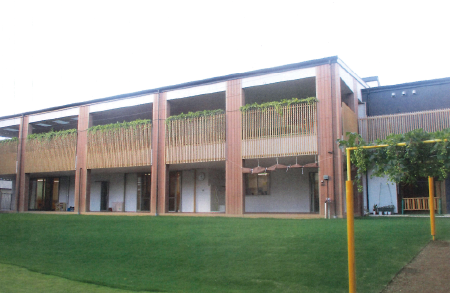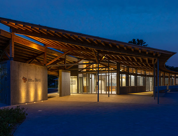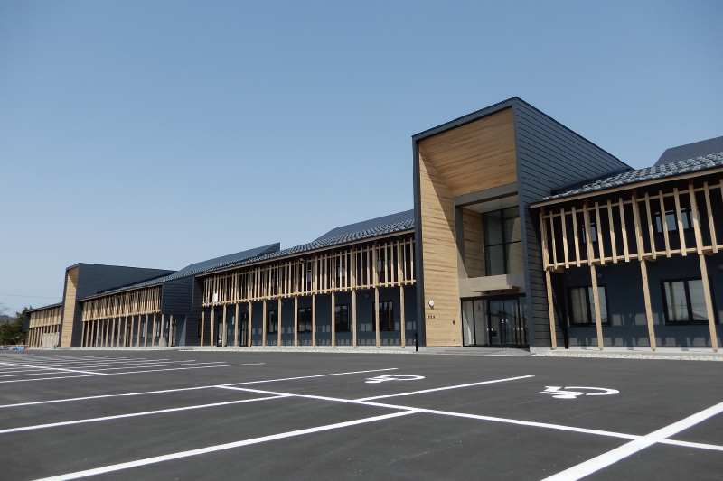 山形県農業総合研究センター園芸試験場〈寒河江市・知事顕彰受賞〉全長111mの迫力ある木造建物。建築部では公共施設・店舗・オフィスビル・工場など様々な建造物を手掛けています。