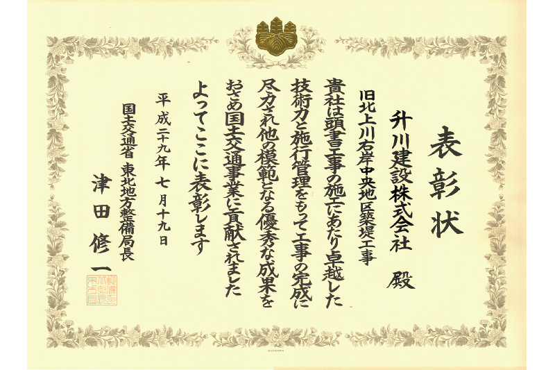 石巻市の堤防〈宮城県・東北地方整備局長表彰受賞〉土木部では宮城県・福島県で数多くの東日本大震災復興関連工事を手掛けています。