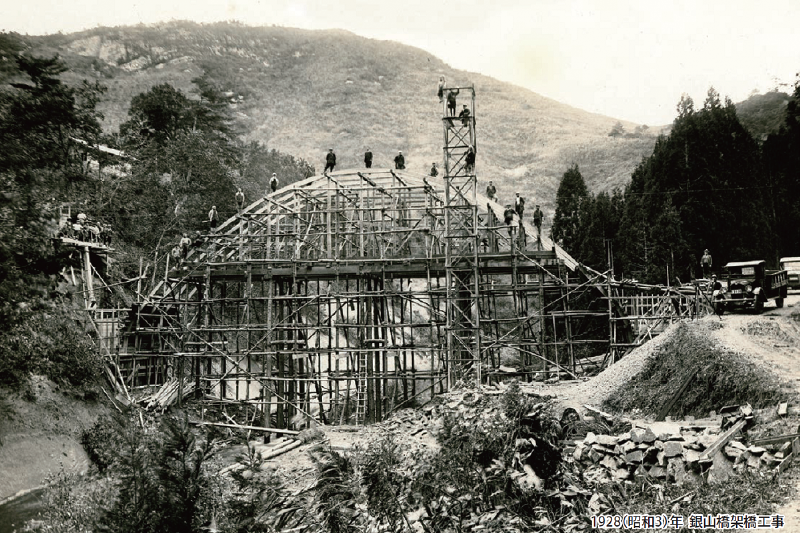 昭和3年、銀山橋架橋工事当時の職人たちの姿。